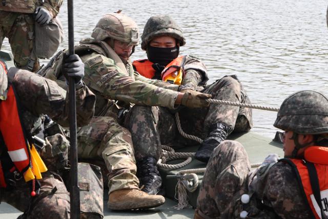 한미연합연습 '을지 자유의 방패(UFS·을지프리덤실드)'가 진행 중인 가운데 지난달 31일 강원도 철원군 도하훈련장에서 육군 7공병여단과 미2사단/한미연합사단 11공병대대 장병이 함께 줄을 당기며 부교를 연결하고 있다. 연합뉴스 |