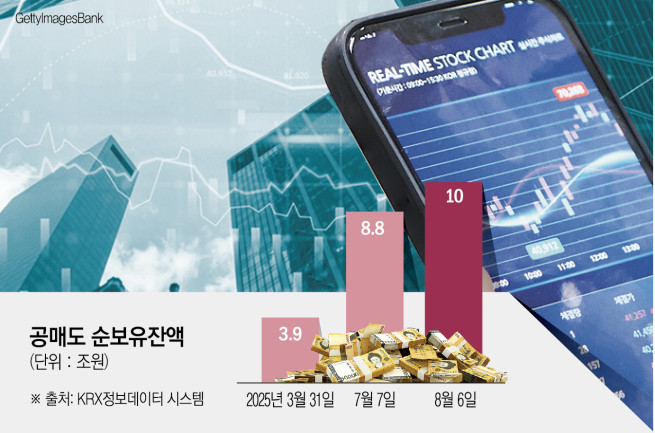 11일 한국거래소 정보데이터시스템에 따르면 지난 6일 기준 코스피 공매도 순보유 잔액은 10조760억 원으로 집계됐다. 이는 지난 3월 공매도 전면 재개 이후 최고치다. 재개 당시인 3월 31일(3조9155억 원) 대비 약 2.6배 증가했다. 불과 넉 달 만에 잔액이 세 배 가까이 불어난 셈이다.