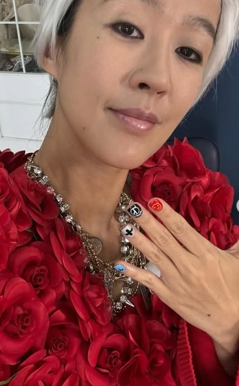 사진 속 그는 백발 가발을 쓰고, 장미꽃이 빼곡히 장식된 의상을 입은 채 손에는 화려한 네일아트를 보이며 포즈를 취했다.