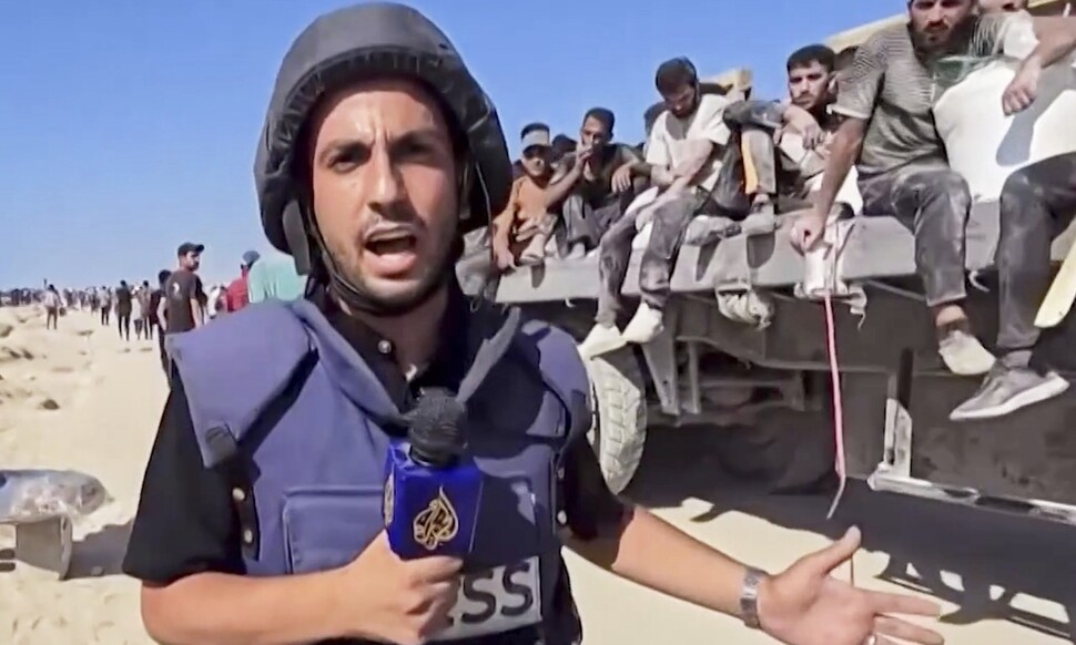 알자지라 기자 아나스 샤리프가 현장 취재하고 있는 사진. 샤리프 등 5명의 알자지라 기자·카메라맨은 11일 자정(현지시각)께 이스라엘군의 드론 공격으로 사망했다. AP 연합뉴스 |