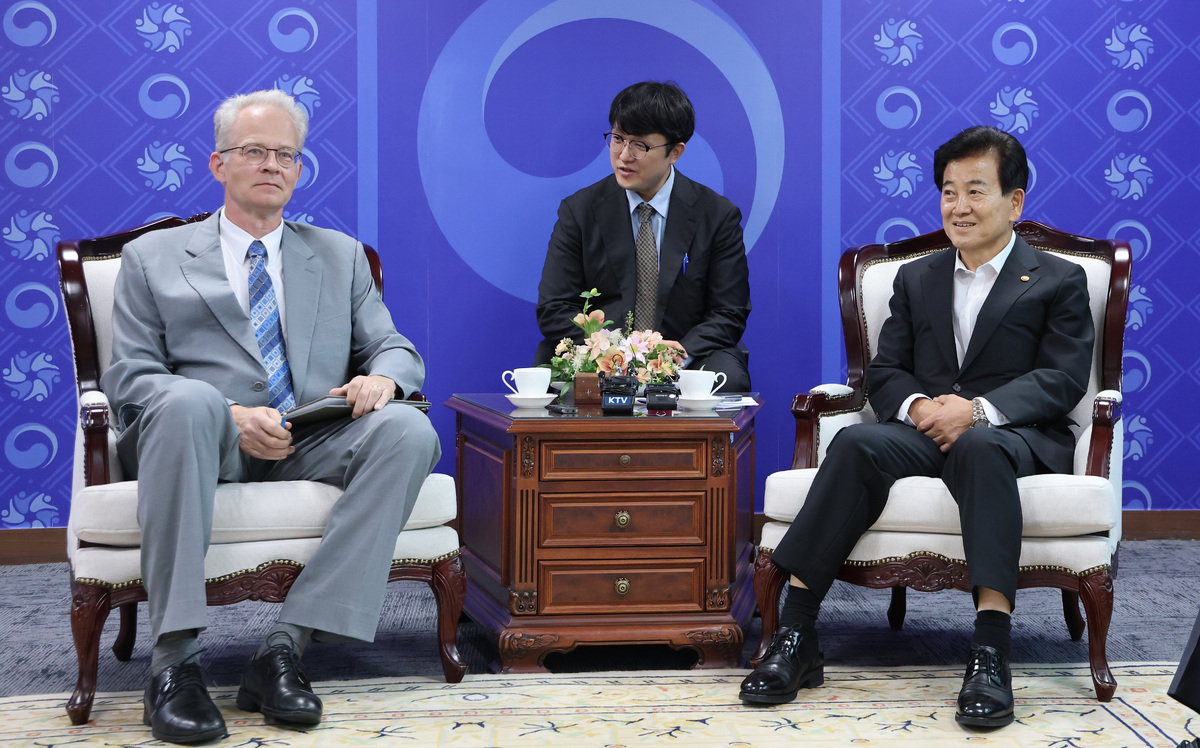 정동영 통일부 장관이 11일 오후 서울 종로구 정부서울청사에서 칼 울르프 안데르손 주한스웨덴대사를 접견하고 있다. 뉴스1 |