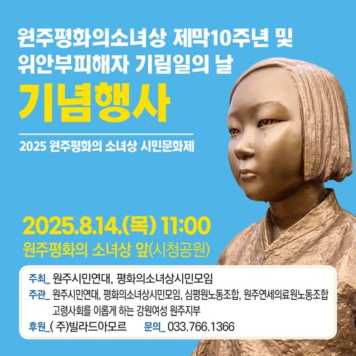 (원주=연합뉴스) 임보연 기자 = 원주시민연대는 위안부 피해자 기림일의 날 기념 및 원주 평화의 소녀상 제막 10주년 기념행사를 14일 원주시청공원 원주 평화의 소녀상에서 개최한다고 12일 밝혔다.