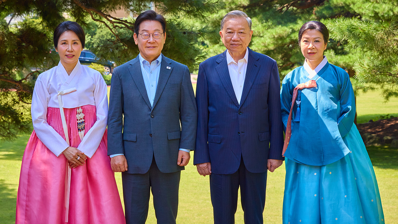 ▲ 이재명 대통령과 김혜경 여사가 12일 청와대 상춘재 앞에서 또 럼 베트남 당 서기장, 배우자 응오 프엉 리 여사와 기념촬영을 하고 있다.