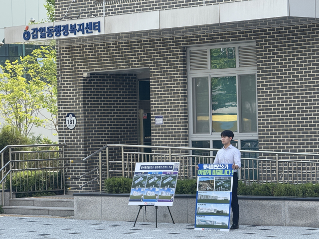 12일 경기 하남시 감일동 행정복지센터 앞 한 남성이 “동서울변전소가 이렇게 바뀝니다”라는 글귀가 적힌 팻말을 들고 시민들이 지나는 길목을 지키고 있었다. 동서울변전소 증설·옥내화 사업을 마치면 오히려 지역사회에 도움이 된다는 내용을 홍보하는 내용이었다.
