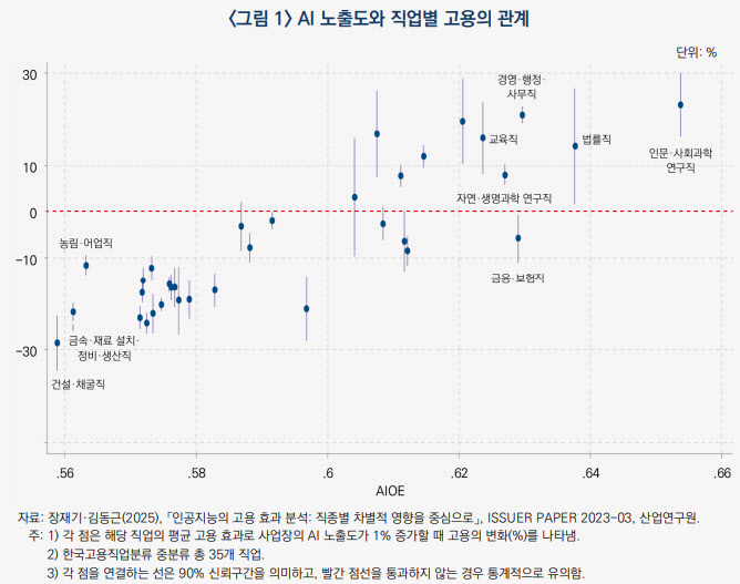 이 결과 AI 노출도가 높은 연구직과 사무직, 교육직, 법률직 등의 고용은 늘어나는 것으로 분석됐다. 주로 고학력을 요하고 사무실에서 근무하는 직업군이다.