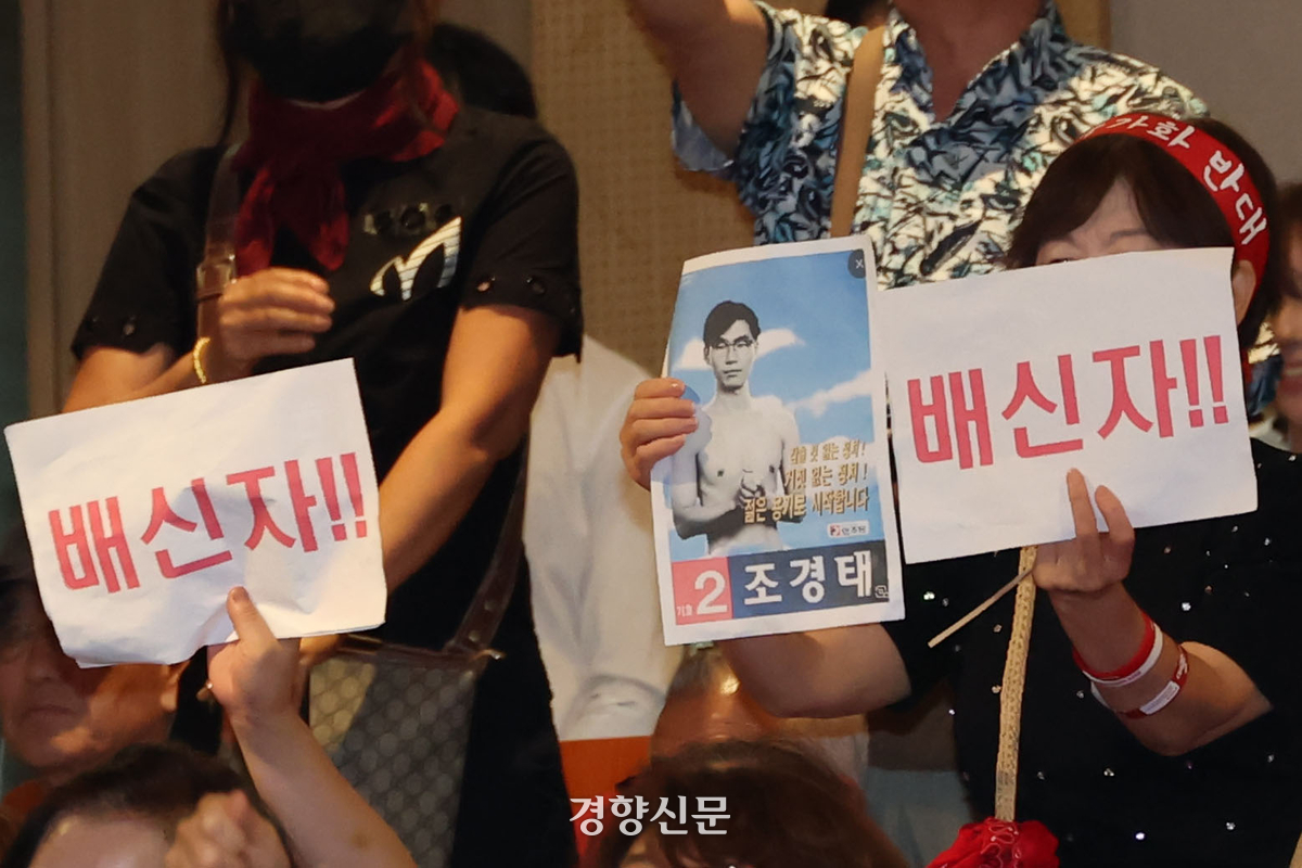 당 대표 후보 연설 때도 비슷한 상황이 반복됐다. 조 후보는 약 4분 동안 소란을 진정시키려 했으나 사회자의 거듭된 진정 요청 후에야 연설을 시작할 수 있었다. 그는 “국민과 당원을 배신한 자는 윤석열 전 대통령”이라며 “탄핵을 반대하고 ‘부정선거’와 ‘윤 어게인’을 주장하는 사람들은 반드시 몰아내야 한다”고 강조했다. 이에 일부 당원들이 욕설을 퍼붓는 등 현장은 다시 소란스러워졌다.