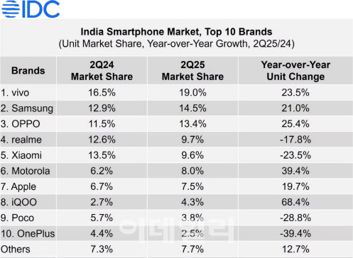 13일 시장조사업체 IDC에 따르면, 삼성은 인도시장에서 갤럭시 A·M·F 시리즈 신제품 출시와 ‘갤럭시 AI’ 기능 확대를 앞세워 전년 동기 대비 21.0% 성장한 14.5% 시장점유율을 기록했다.