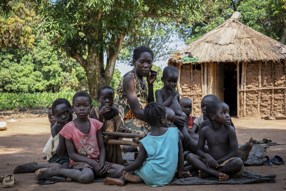 올해 6월26일(현지시각) 남수단 문드리 웨스트 카운티 코토비에서 다섯자녀를 둔 보비아 카와자(34)이 자신의 자녀와 이웃 아이들과 함께 집 밖에 앉아있다. 문드리웨스트/AP 연합뉴스 |