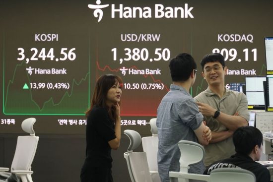 코스피 지수가 4년 만에 최고치를 넘어서며 연일 기록을 경신하고 있는 가운데 30일 서울 중구 하나은행 딜링룸 모니터에 코스피를 비롯해 원/환율 등이 표시돼 있다. 이날 코스피는 장 초반 3,235대에서 강보합세를 보이고 있다. 오전 9시 2분 현재 코스피는 전장보다 7.53포인트(0.23%) 오른 3,238.10을 보이고있다. 2025.7.30 조용준 기자 |