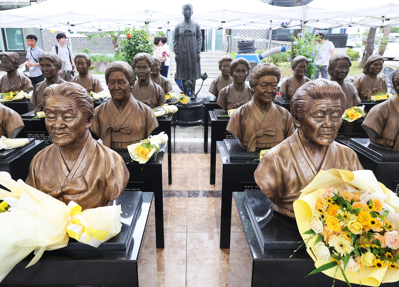 지난 9일 경기도 광주시 나눔의집에서 열린 ‘2025년 일본군 위안부 피해자 기림의 날’ 기념식에서 지난해 별세한 박옥선 할머니와 올해 별세한 이옥선 할머니의 흉상이 세워져 있다. [연합] |