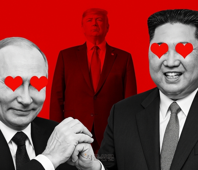 블라디미르 푸틴 러시아 대통령과 도널드 트럼프 미국 대통령, 김정은 북한 국무위원장. 인공지능(AI) 생성 이미지. |