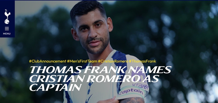 토트넘 구단은 13일(한국시간) 홈페이지를 통해 ‘로메로가 손흥민이 떠난 이후 토마스 프랭크 감독으로부터 새 수장으로 지명됐다’고 밝혔다. 그러면서 ‘로메로는 손흥민이 주장으로 선임된 2023년 8월 제임스 매디슨과 함께 부주장으로 임명된 적이 있다’고 덧붙였다.