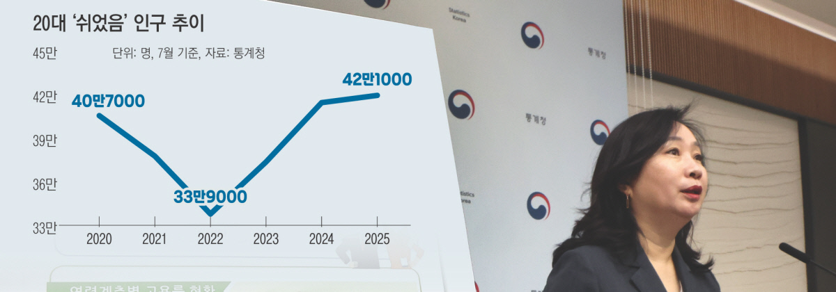 일이나 구직활동을 하지 않는 20대 ‘쉬었음’ 인구도 42만1000명으로 7월 기준 역대 가장 많았다. 내수 부진 여파가 청년층 고용에도 영향을 미치고 있는 것으로 풀이된다. 청년층 비중이 높은 숙박음식업 분야 취업자는 1년 전보다 7만1000명 줄며 코로나19 팬데믹 시기인 2021년 11월 이후 3년8개월 만에 가장 크게 감소했다. 건설업 취업자 수는 전년 대비 9만2000명 줄었다. 제조업 취업자도 7만8000명 감소했다. 두 분야 모두 감소폭은 전달보다 소폭 줄었지만 각각 15개월, 13개월째 내림세가 이어지고 있다. 공미숙 통계청 사회통계국장은 “아직 ‘민생회복 소비쿠폰’ 영향은 반영되지 않았다”고 설명했다.