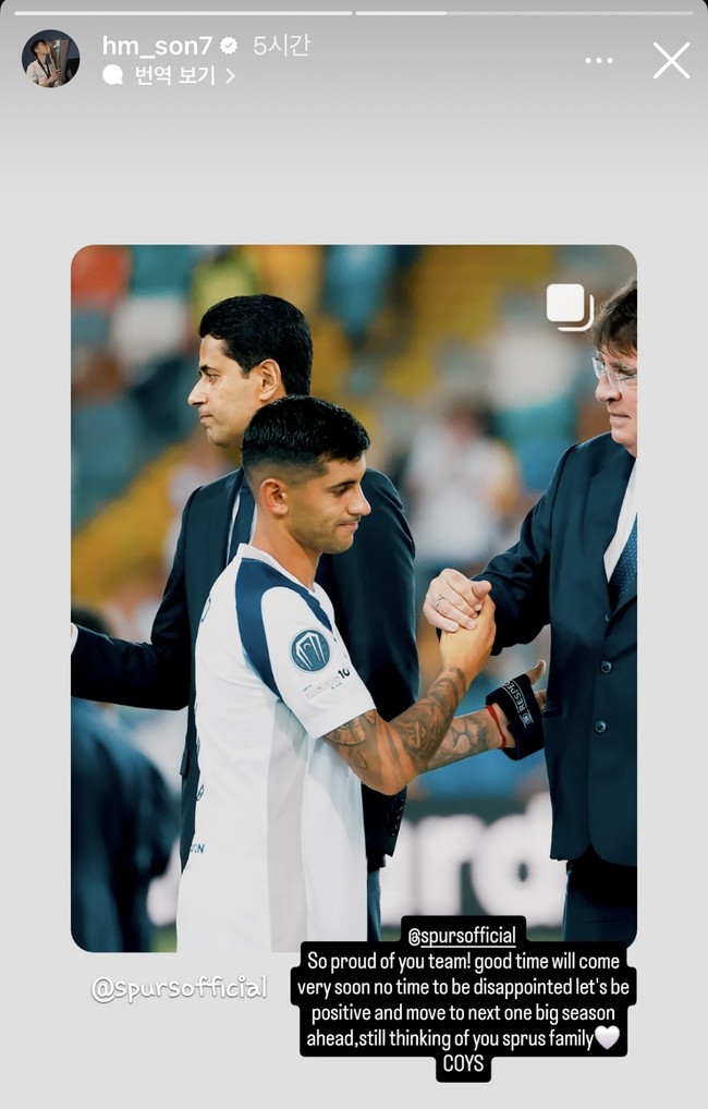 경기 후 손흥민이 자신의 SNS를 통해 토트넘 선수단을 위로했다. 그는 "너희들이 자랑스럽다. 좋은 시간이 올 거다. 실망할 시간이 없다. 긍정적으로 생각하고 다음 시즌을 향해 가자. 여전히 토트넘 가족들을 생각하고 있다"라고 전했다.