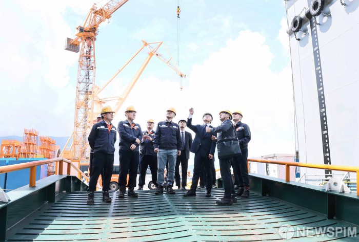 [서울=뉴스핌] 김정관 산업통상자원부 장관이 14일 취임후 첫 번째 산업현장 행보로 경남 거제시에 소재한 한화오션 거제사업장을 방문하여,김희철 한화오션 대표를 비롯한 관계자 등이 참석한 가운데 2척의 초대형 액화천연가스(LNG) 운반선 명명식에 참석하여, 축사와 명명식을 축하하는 세리머니를 갖은 후 특수선 제작 야드현장을 둘러보고 있다.[사진=산업통상자원부] 2025.08.14 photo@newspim.com