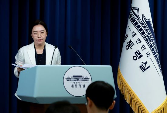 강유정 대통령실 대변인이 14일 서울 용산 대통령실 청사에서 15일 예정된 국민임명식 등에 대한 브리핑을 하기 위해 마이크 앞으로 향하고 있다. 연합뉴스 |