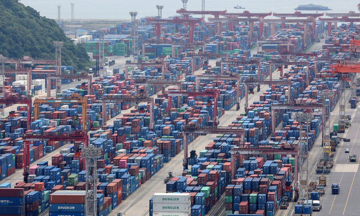 부산항 신선대부두 야적장에 컨테이너가 가득 쌓여 있는 모습. 뉴스1 |