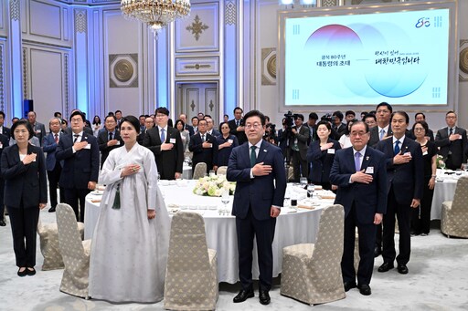 이재명 대통령이 14일 청와대 영빈관에서 열린 ‘광복 80주년, 대통령의 초대’ 행사에서 국민의례를 하고 있다. 이 대통령은 이번 행사에 독립유공자 후손 등 80여명을 초청해 오찬을 함께했다.