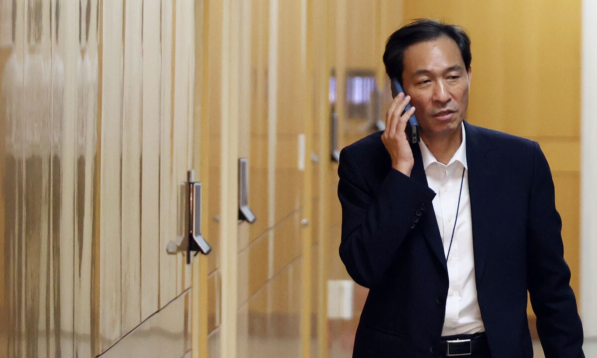 우상호 정무수석이 14일 용산 대통령실에서 통화하며 수석보좌관회의장으로 이동하고 있다. 연합뉴스 |
