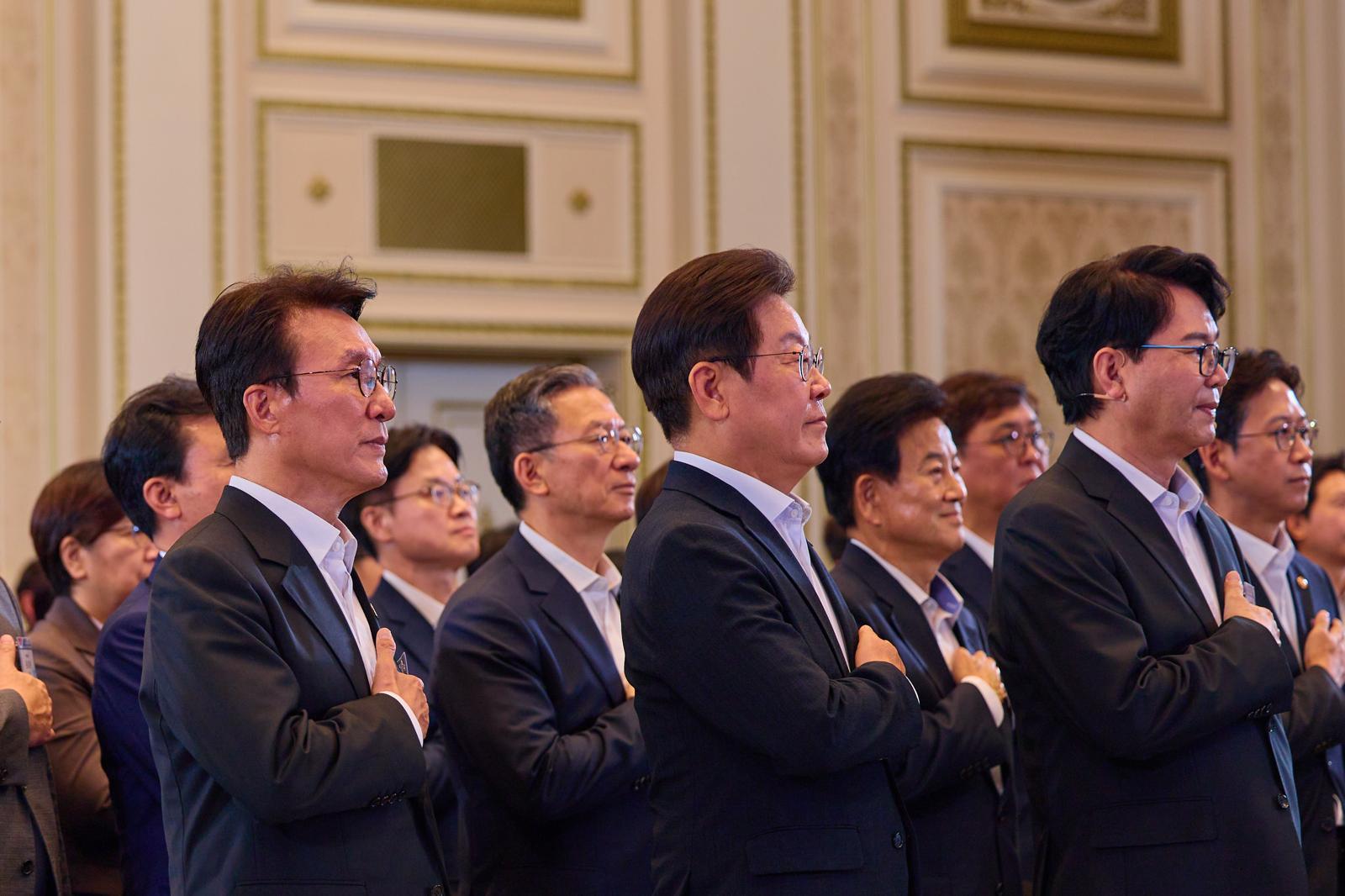 이재명 대통령이 지난 13일 청와대 영빈관에서 열린 국정기획위원회 국민보고대회에서 국민의례를 하고 있다. 2025.8.13/대통령실 제공 |