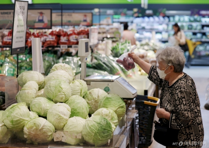 [서울=뉴시스] 김진아 기자 = 전국에 역대급 무더위가 이어지면서 주요 농축산물 가격이 연일 급등하고 있다. 한국농촌경제연구원 농업관측센터 집계에 따르면 지난 7월 ‘생계'(양배추·무 등 주요 채소)의 산지 가격은 1kg당 1,954원으로 전년 동월(1,563원) 대비 25% 급등했다. 여름 제철과일 역시 가격이 눈에 띄게 올랐다. 한국농수산식품유통공사(aT) 자료를 보면 8일 기준 복숭아(10개)는 2만 2,858원으로 전년 같은 기간보다 35% 폭등했고, 수박(1개)은 3만 1,555원(11%↑), 참외(10개)는 2만 2,509원(17%↑)으로 오름세다. 특란 30구의 전국 평균 가격은 7387원이다. 사진은 11일 서울의 한 마트에 채소가 진열돼 있다. 2025.08.11. |