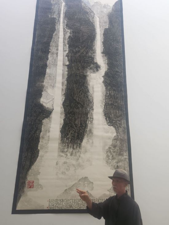 14일 리안갤러리 대구에서 열린 간담회에서 박대성 화백이 자신의 '폭포' 작품 앞에서 설명하고 있다. 서믿음 기자 |