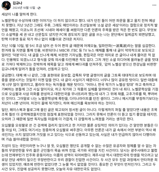 김 작가는 지난해 10월 한강 작가가 노벨상을 수상하자 "역사 왜곡의 정당화"라며 '5·18민주화운동'을 '거짓 역사'라고 폄훼했습니다.