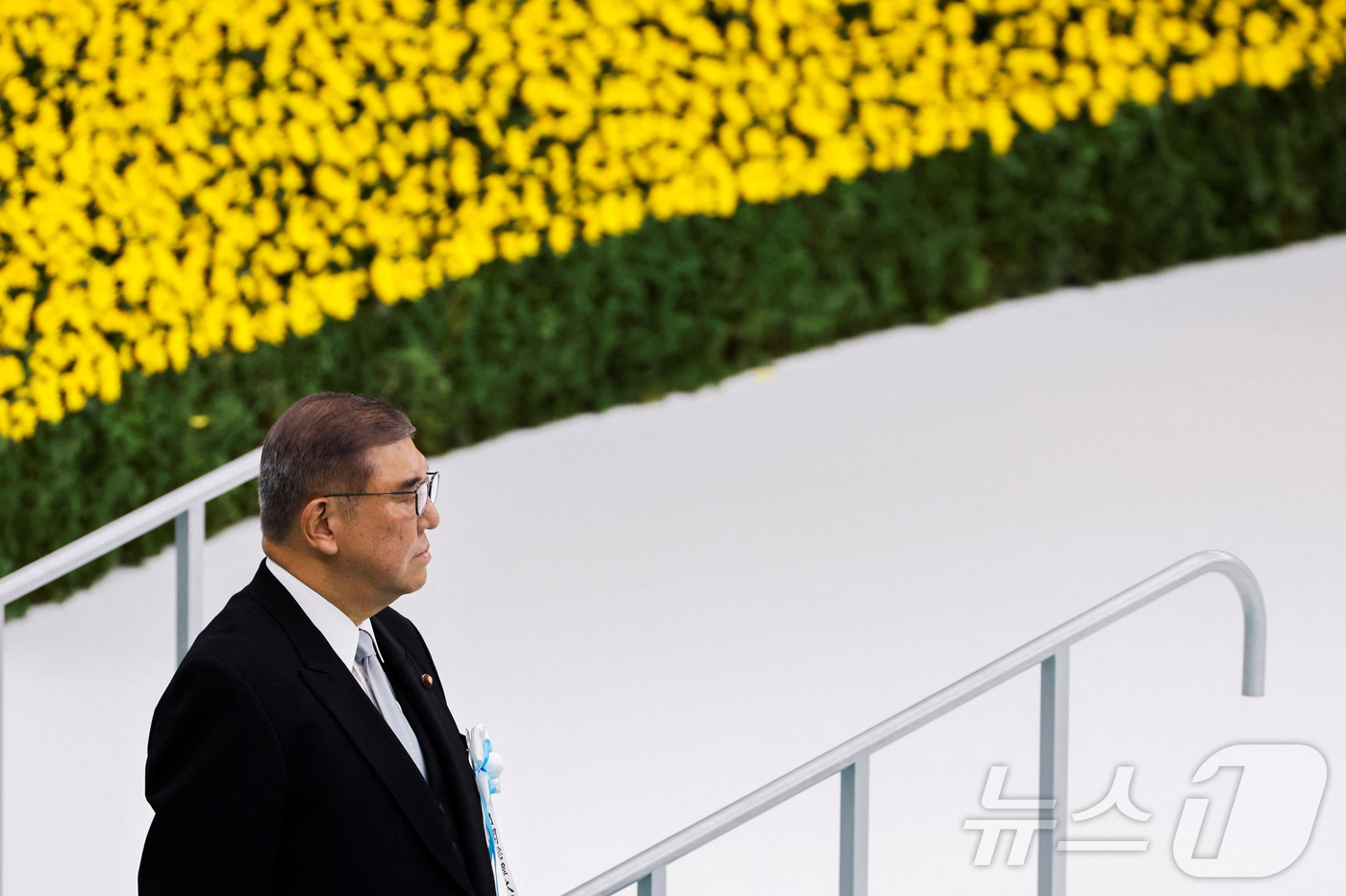 (로이터=뉴스1) 김진환 기자 = 이시바 시게루 일본 총리가 패전 80년을 맞은 15일 도쿄 일본 무도관에서 열린 '전국 전몰자 추도식’에 참석하고 있다. 이날 이시바 총리는 식사(式辭)에서 "전쟁의 참화를 결단코 되풀이하지 않겠다"며 "그 전쟁의 반성과 교훈을 이제 다시 가슴 깊이 새겨야 한다"고 말했다. 일본 총리가 패전일 전몰자 추도사에서 '반성'이라는 단어를 언급한 것은 13년 만이다. ⓒ 로이터=뉴스1