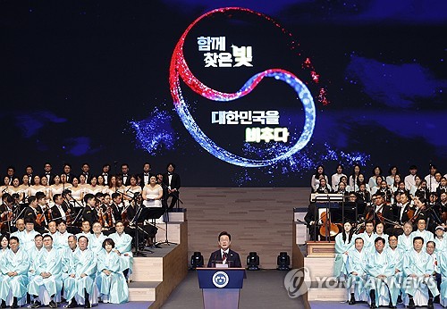 (서울=연합뉴스) 홍해인 기자 = 이재명 대통령이 15일 서울 세종문화회관에서 열린 80주년 광복절 경축식에서 경축사를 하고 있다. 2025.8.15 [대통령실통신사진기자단] hihong@yna.co.kr |