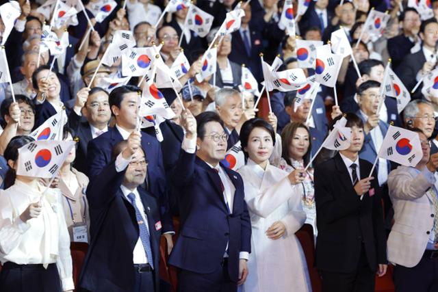 이재명 대통령과 김혜경 여사가 15일 서울 세종문화회관에서 열린 제80주년 광복절 경축식에서 참석자들과 태극기를 흔들고 있다. 뉴시스 |