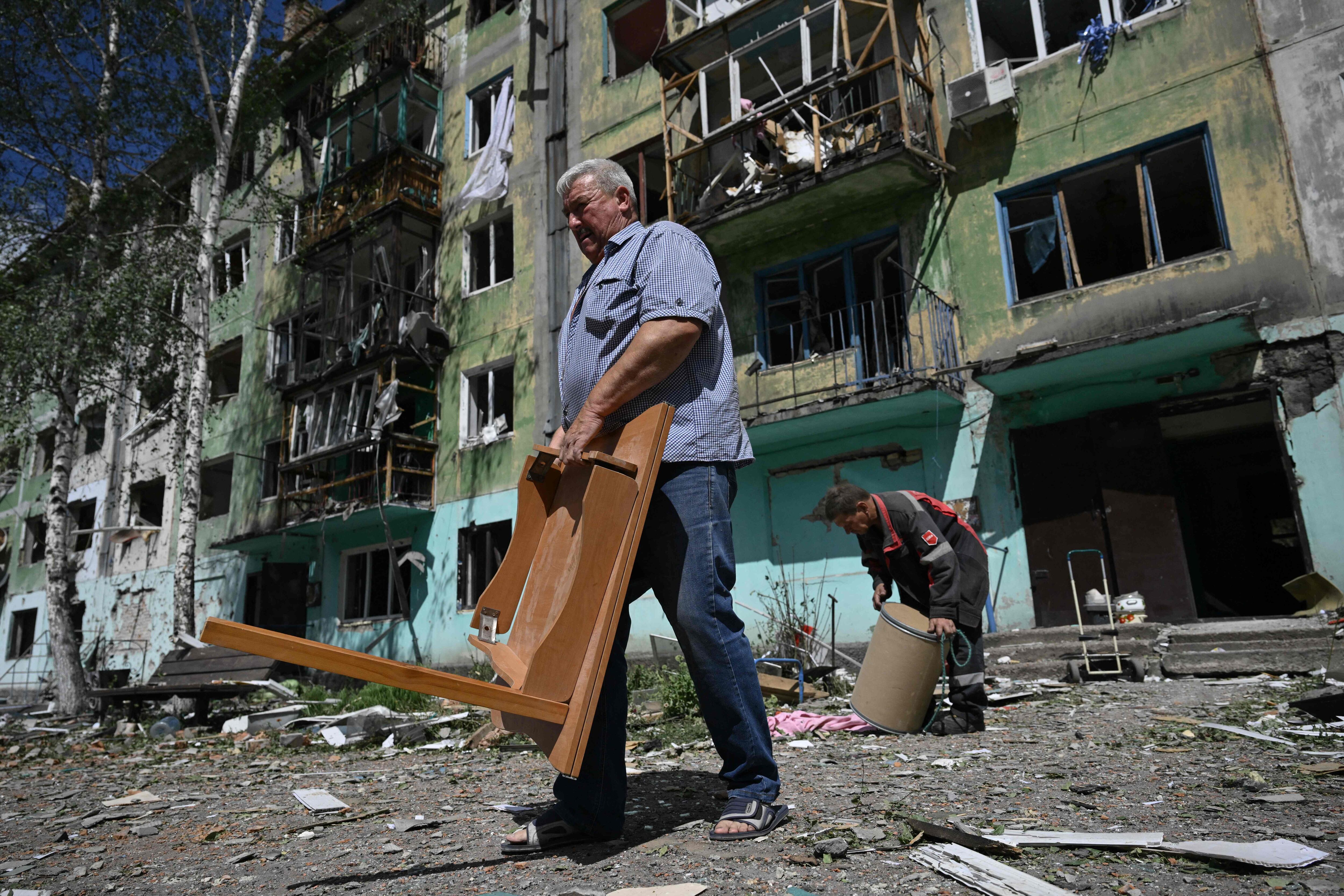 우크라이나 도네츠크주 빌로제르스케에서 12일 러시아군의 공격으로 심하게 파손된 주거 건물에서 주민들이 짐을 옮기고 있다. 러시아군이 이 지역에서 진격하자 주민들의 대피가 이어지고 있다 /AFP 연합뉴스 |