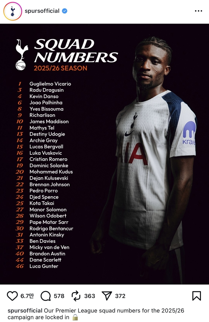 토트넘은 16일 2025~2026시즌 스쿼드의 등번호를 발표했다.