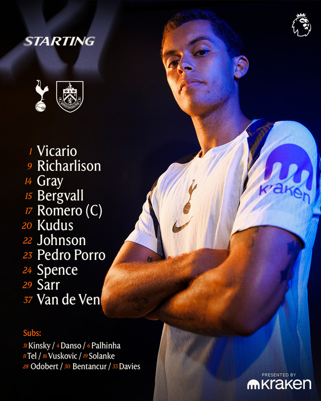 토트넘은 선발 라인업을 공개했다. 비카리오, 히샬리송, 그레이, 베리발, 로메로, 쿠두스, 존슨, 포로, 스펜스, 사르, 판 더 펜이 선발로 나선다.