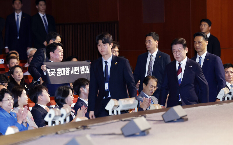 제80주년 광복절 경축식이 열린 15일 오전 서울 종로구 세종문화회관. 이재명 대통령의 경축사가 시작되자 내빈석에 앉아있던 안철수 국민의힘 의원이 갑자기 자리에서 일어났다. 양손에 ‘조국·윤미향 사면 반대’라고 적힌 펼침막을 들고 침묵 시위를 시작했다. 기습적인 시위에 행사 관계자로 보이는 인사가 자제를 부탁하는 모습이 보였지만 안 의원은 멈추지 않았다. 전 정부에서처럼 대통령 경호처의 물리적 제지는 없었다. 이 대통령이 경축사를 마치고 연단을 내려와 안 의원 앞을 지나갈 때까지 시위는 멈추지 않았다. 굳은 표정의 이 대통령은 안 의원 쪽에 눈길을 주지 않았다. 이 대통령이 지나간 뒤에야 안 의원은 펼침막을 접고 자리에 앉았다.