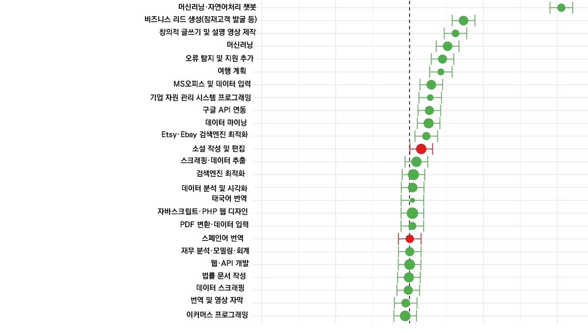 덴마크 코펜하겐대 사회데이터과학센터는 2022년 챗GPT의 등장 이후 빠르게 프리랜서 일자리의 증감을 분석했다. 점선 왼쪽에 위치할 수록 구인공고가 줄어든 직종이다. 출처: ‘생성형 AI의 승자와 패자: 프리랜서 수요 변화의 초기 증거’(올레 토이틀로프 코펜하겐대 교수 등) |