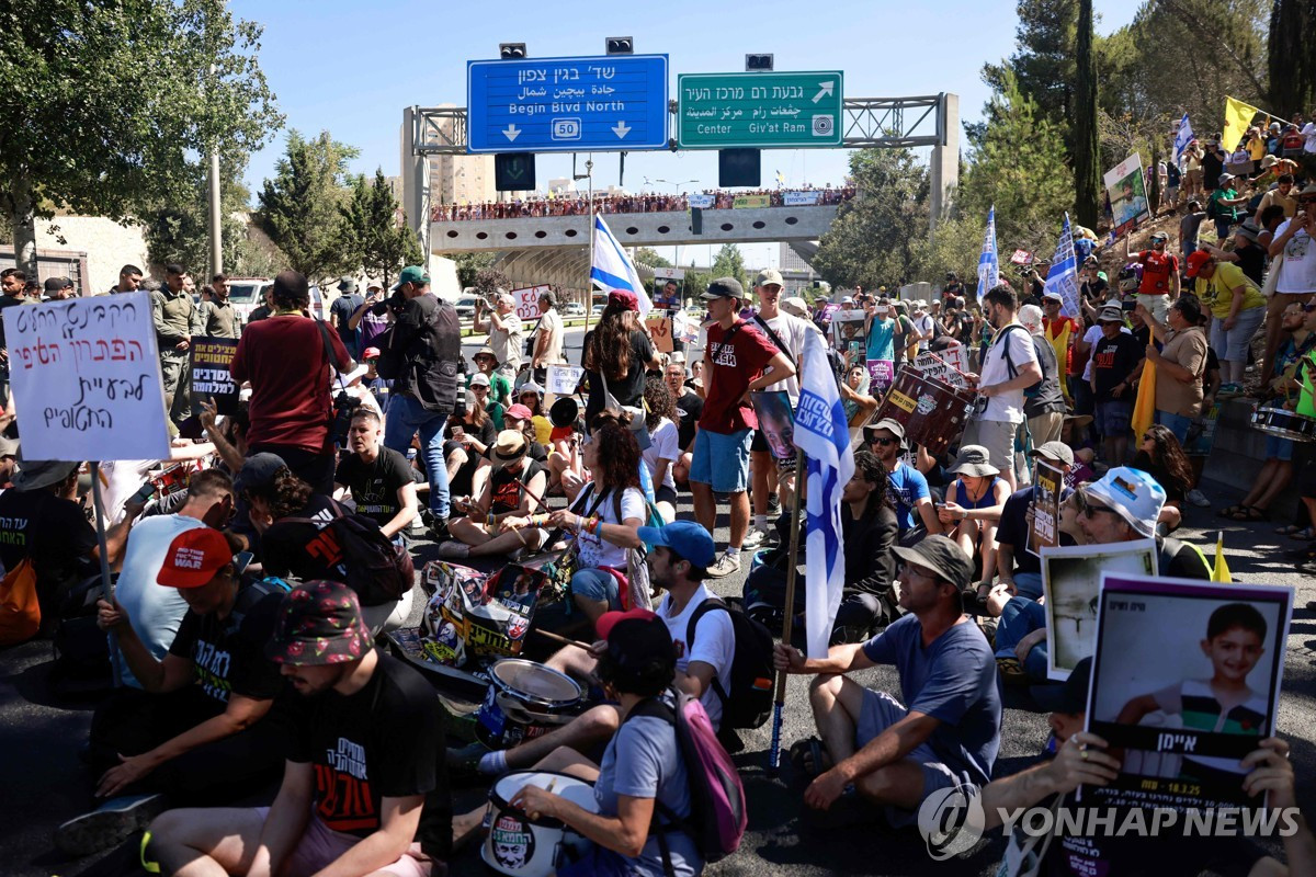 이들은 주말 뒤 첫 평일인 이날 텔아비브와 예루살렘을 잇는 1번국도 등 주요 고속도로를 점거하고 차로 위에 불을 피우며 시위를 벌였습니다.