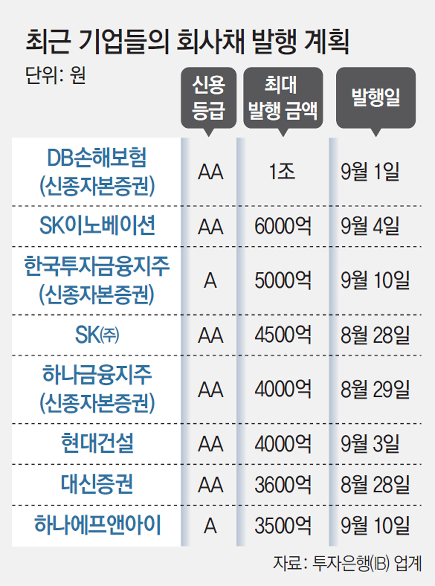 DB손해보험은 회사채 발행 규모가 최대 1조 원 규모로 예상된다. 발행 액수는 발행사가 정한 목표 금액에서 추후 수요 예측을 고려해 결정한다. 한국투자금융지주와 하나금융지주도 각각 최대 5000억 원, 4000억 원으로 비교적 큰 편이다. 하나에프앤아이도 최대 3500억 원 수준의 회사채를 발행한다. 일반 기업으로는 SK㈜가 최대 4500억 원, SK이노베이션이 6000억 원을 고려할 정도로 회사채 발행에 적극적으로 나서고 있다.