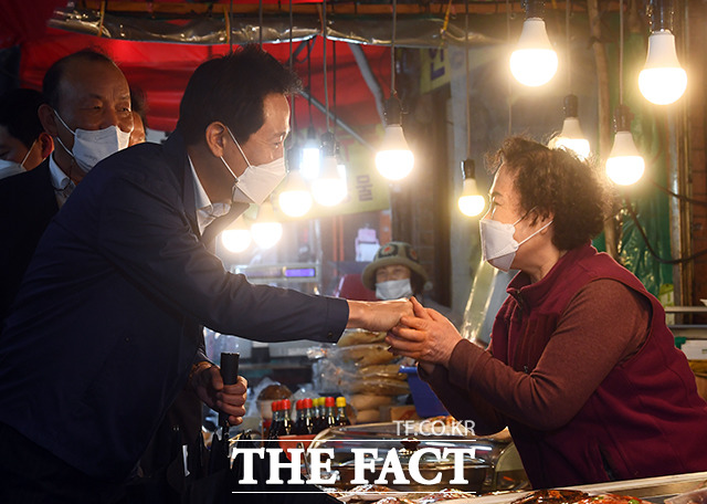 서울시는 자영업자를 위한 '안심통장 2호'를 오는 28일부터 출시한다고 18일 밝혔다. 오세훈 서울시장이 서울 서대문구 인왕시장을 찾아 상인들과 인사를 나누고 있다./더팩트 DB |
