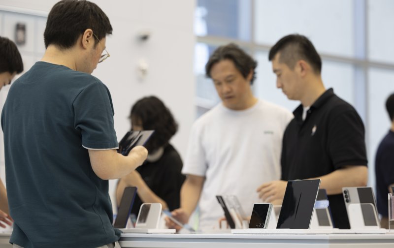 삼성전자 신형 폴더블 스마트폰 갤럭시 Z 폴드7 및 플립7 공개 첫 날인 지난달 10일 서울 서초구 삼성 강남점에서 소비자들이 스마트폰을 살펴보고 있다.사진=뉴시스화상 |