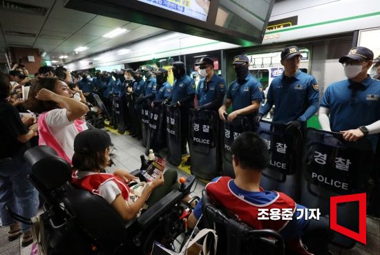서울교통공사에 따르면 전장연은 이날 오전 7시30분부터 명동역 승강장에서 지하철 탑승 시위를 진행하며 공사 측과 대치했다. 이에 공사는 오전 8시32분부터 상행 열차 18대, 하행 열차 16대를 무정차로 통과시켰다.