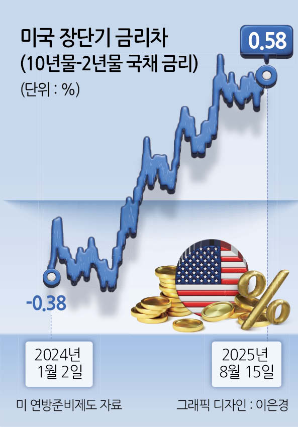 18일 미국 재무부에 따르면 지난 15일 미국 국채 10년물과 2년물 금리차(일드 커브)인 장단기 금리차는 0.58%포인트로, 지난 4월을 제외하고 3년 6개월만에 가장 높은 수준을 기록했다. 지난 4월은 트럼프 미국 대통령의 관세 부과와 파월 연준 의장 흔들기로 미국 10년물 장기채 금리가 폭등했던 시기다.