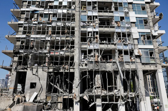 6월19일(현지시각) 이스라엘 라마트간에서 이란의 미사일 공격 이후 손상된 건물 모습. 라마트간/로이터 연합뉴스 |