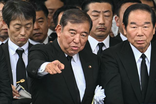 이시바 시게루(앞줄 가운데) 일본 총리가 9일 나가사키현 나가사키시 평화공원에서 열린 원폭투하 전몰자 위령식에서 손가락으로 앞을 가리키고 있다. 나가사키=AFP 연합뉴스 |