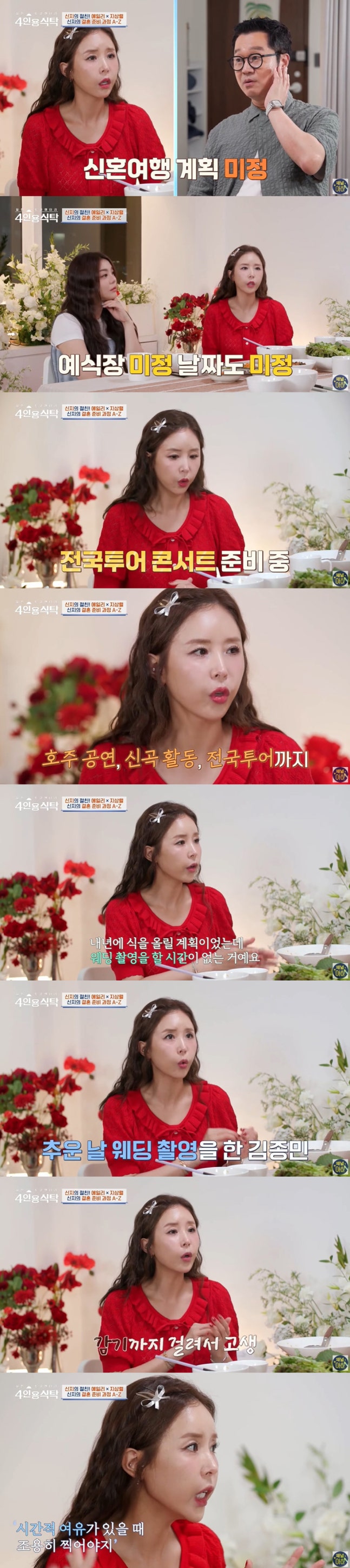 신지는 "내년에 식을 올릴 계획이었는데 웨딩 촬영을 할 시간이 없더라"며 "종민 오빠가 추운 날 웨딩 촬영을 했는데 감기에 걸려서 고생을 했다. 그 모습을 봤기 때문에 시간이 여유가 있을 때 '조용히 미리 찍어놓자'고 했다"며 미리 웨딩 촬영을 한 이유를 밝혔다.