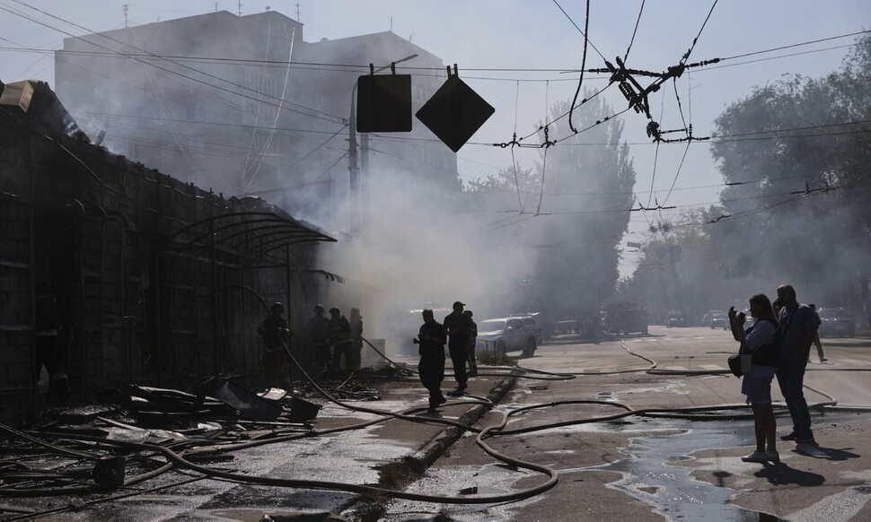 18일 우크라이나 소방대원들이 자포리자에서 러시아군 공습으로 불탄 상점의 진화 작업을 벌이고 있다. AP 연합뉴스 |