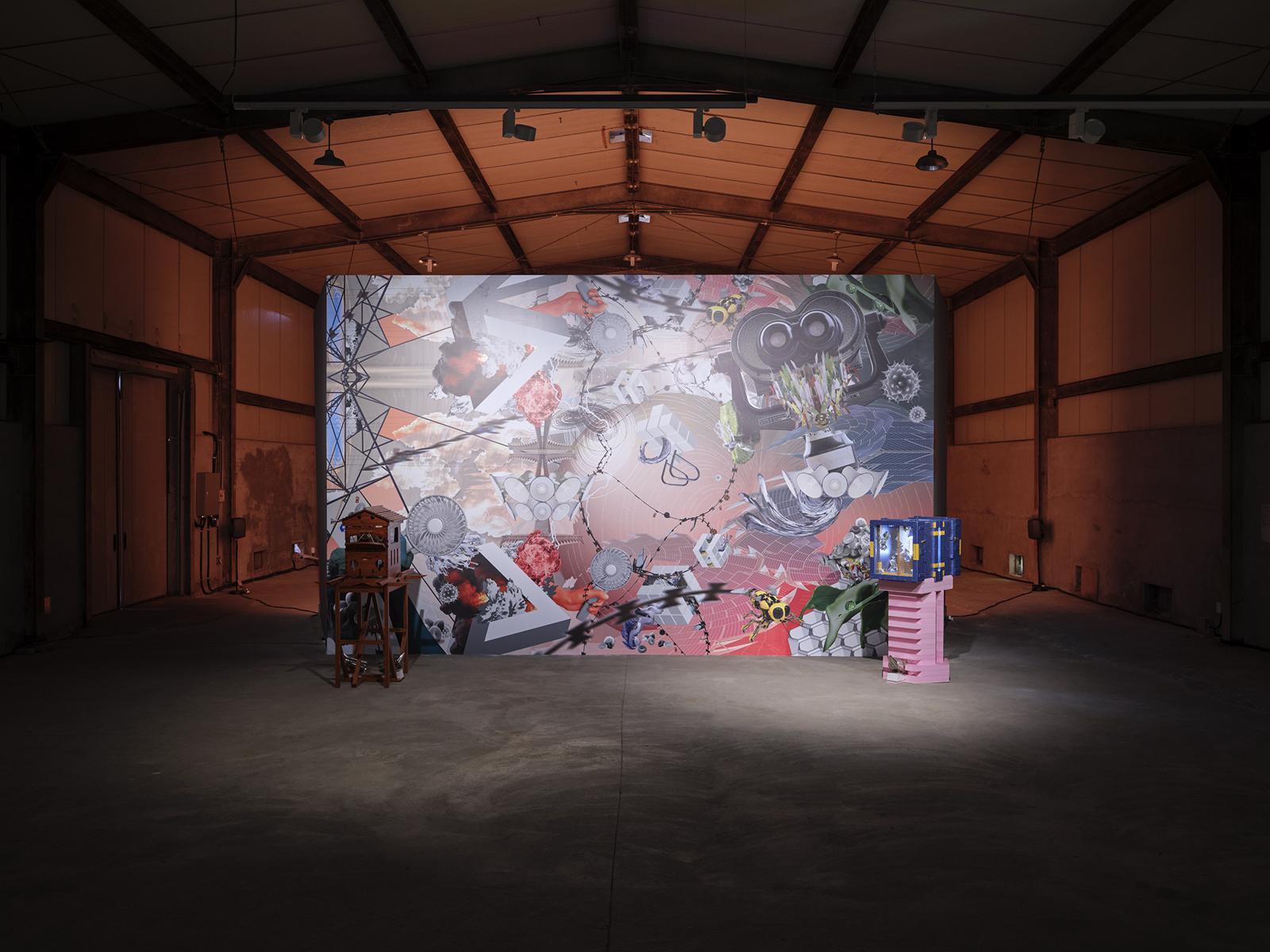 통일촌 수매창고의 양혜규 작품 ‘디엠지 비행’, ‘가마벌 신당’, ‘등대벌 이중맨션’. 작가 제공 |