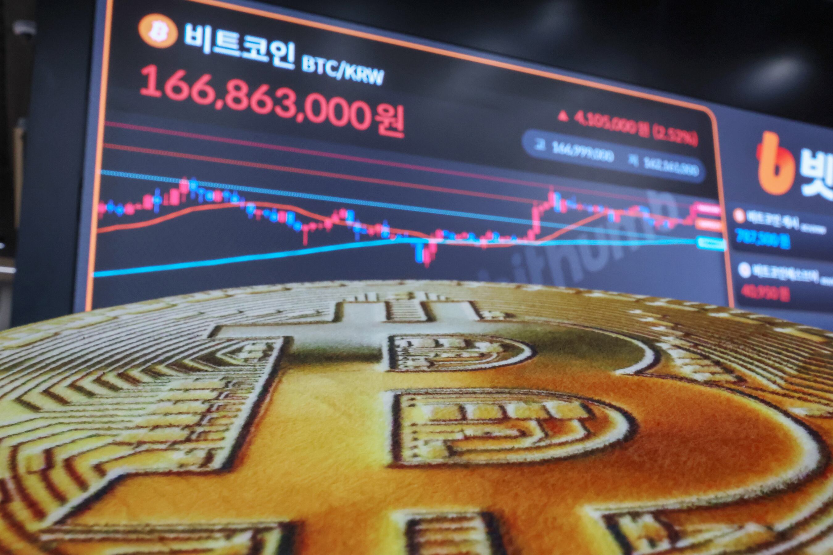 서울 강남구 서초구 빗썸라운지 강남본점 전광판에 비트코인 시황이 나타나고 있다./뉴스1 |