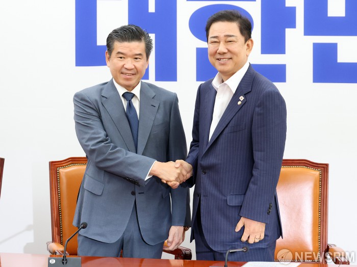 [서울=뉴스핌] 정일구 기자 = 김병기 더불어민주당 원내대표와 제임스 김 주한미국상공회의소(AMCHAM·암참) 회장이 19일 오전 서울 여의도 국회에서 만나 악수를 하고 있다. 2025.08.19 mironj19@newspim.com
