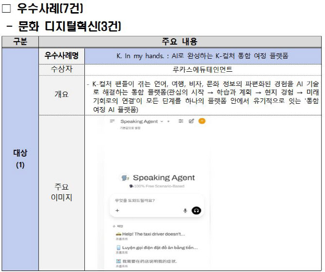 우수사례 부문 대상은 K컬처 통합 여정 플랫폼인 ‘케이 인 마이핸즈’와 국악 가상악기 ‘조선시리즈’가 차지했다. 케이 인 마이핸즈는 K컬처 팬들에게 언어, 여행, 비자 등의 정보를 제공하고, K콘텐츠 학습부터 실제 여행, 현지 소통까지 끊김 없는 경험을 지원하는 플랫폼이다. 조선 시리즈는 국립국악원이 제공하는 6000여개의 국악기 디지털음원을 AI로 최적화해 창작자 누구나 국악 음원을 생성할 수 있도록 한 서비스다.
