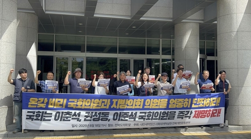 (전주=연합뉴스) 나보배 기자 = 민주노총 전북본부 등으로 구성된 전북개헌운동본부는 19일 전북도의회 앞에서 기자회견을 열고 "이춘석, 권성동, 이준석 국회의원을 즉각 제명하라"고 촉구했다.